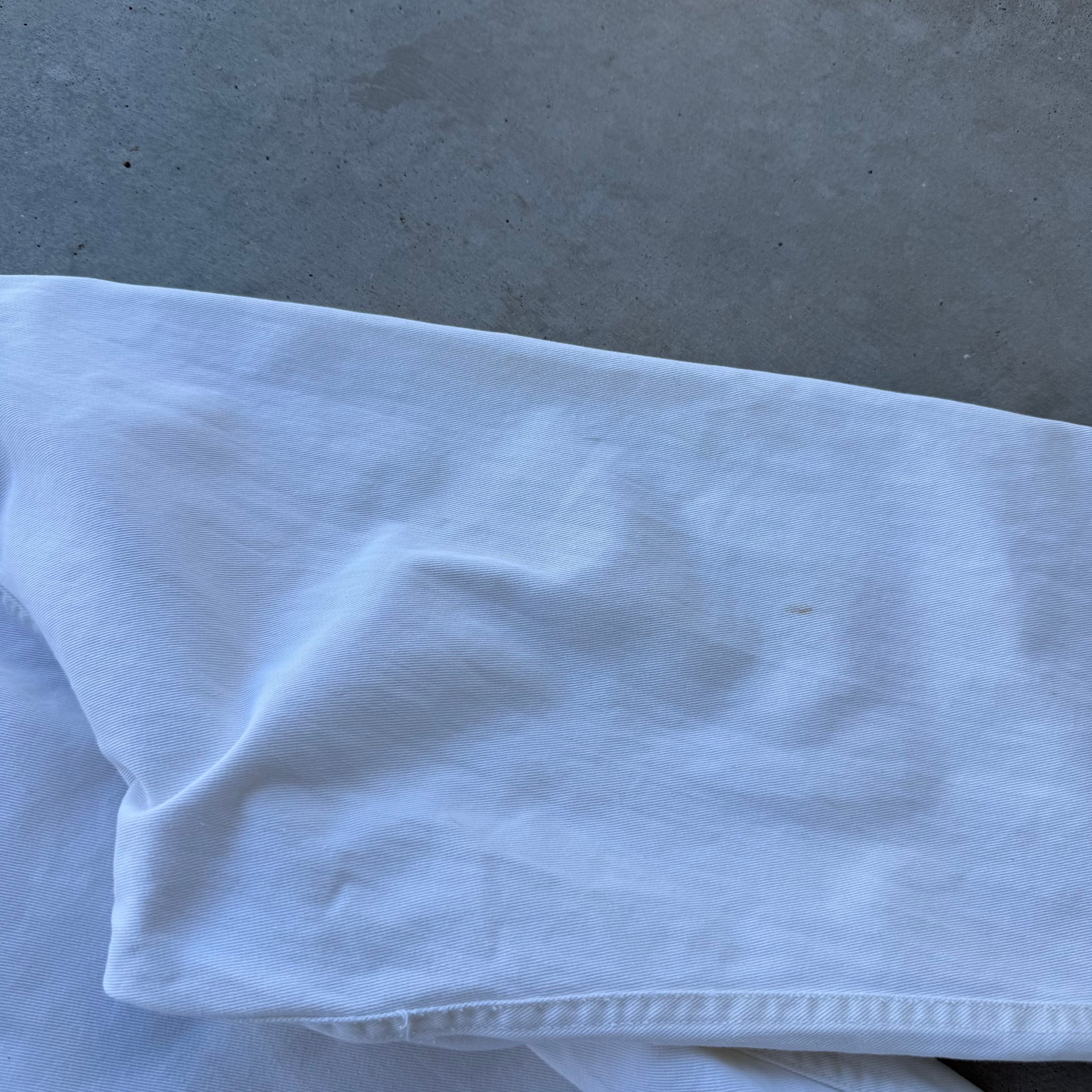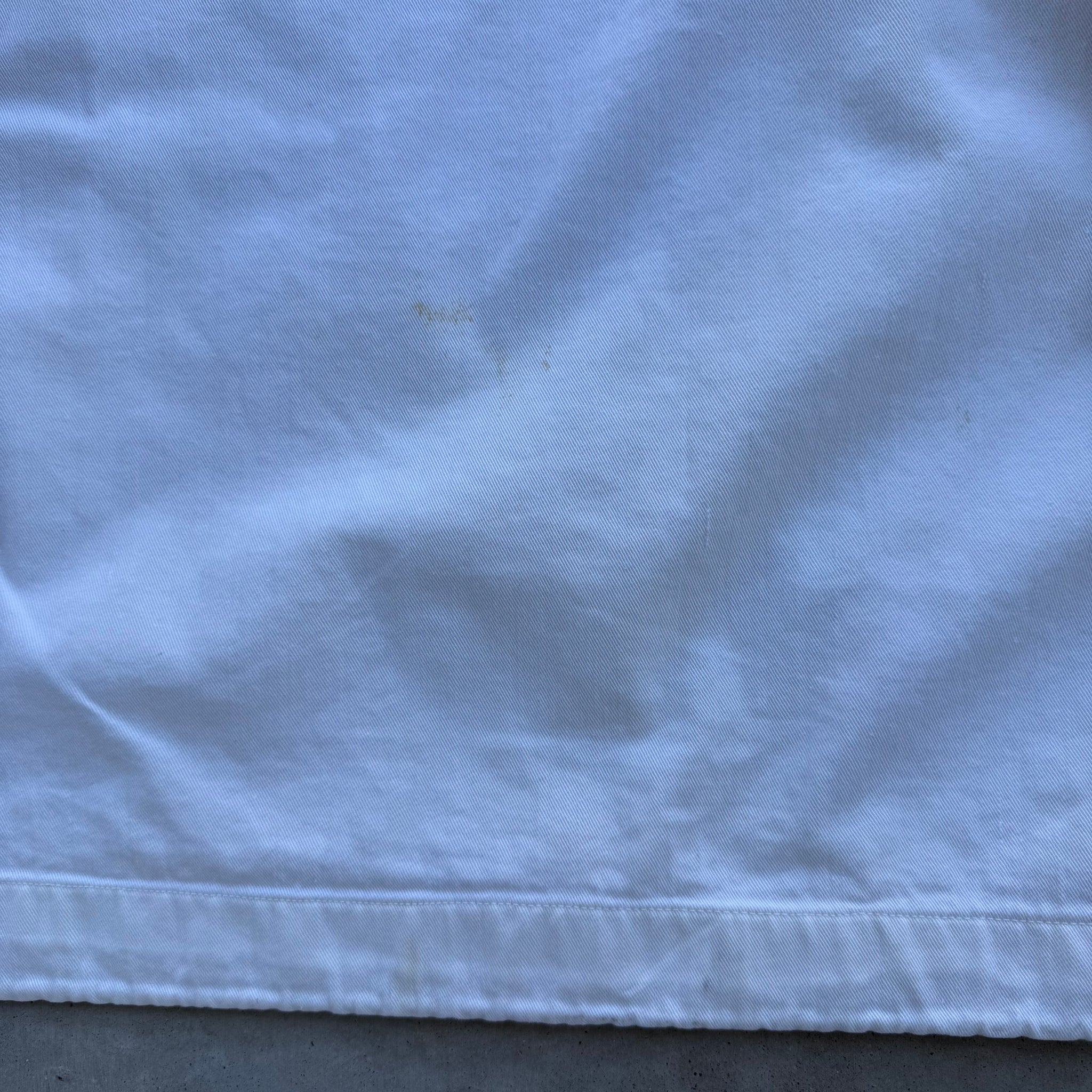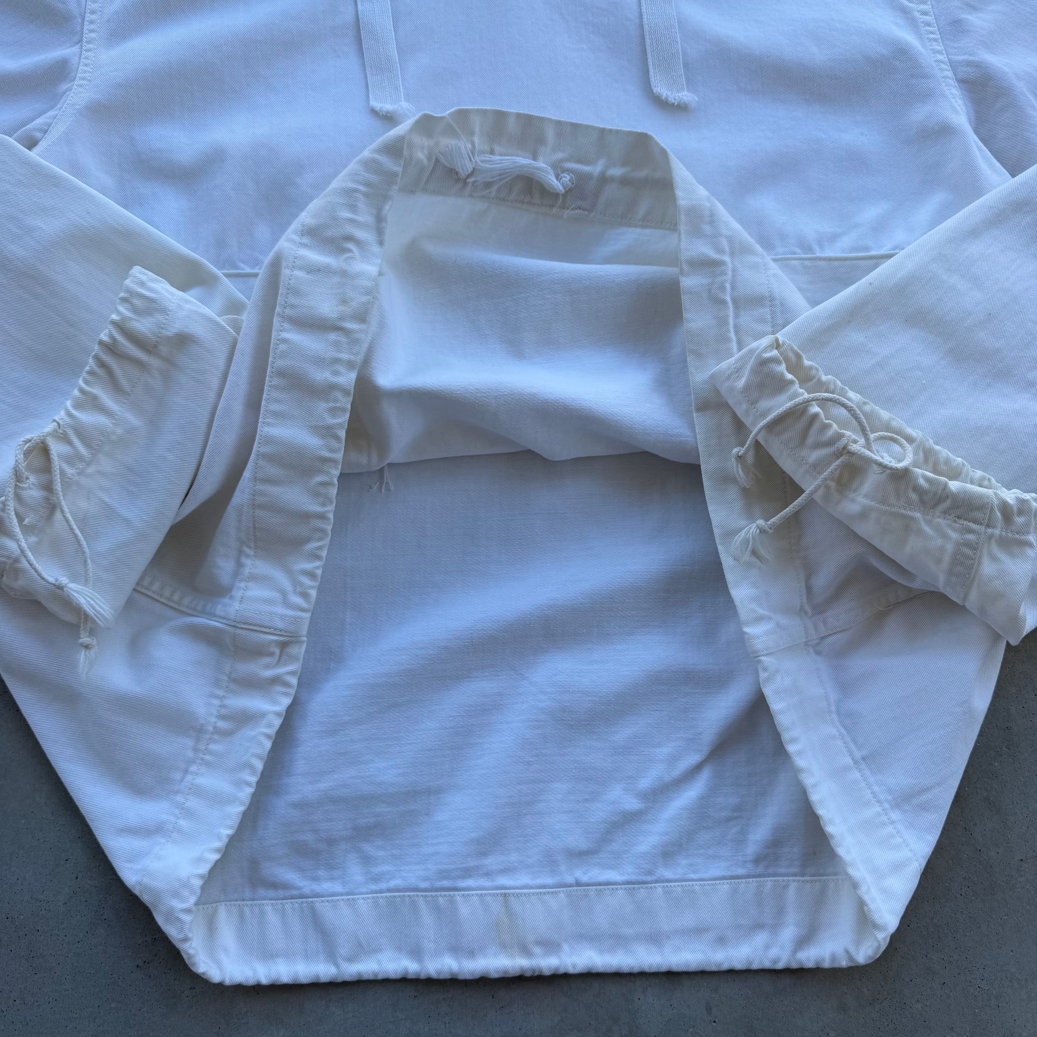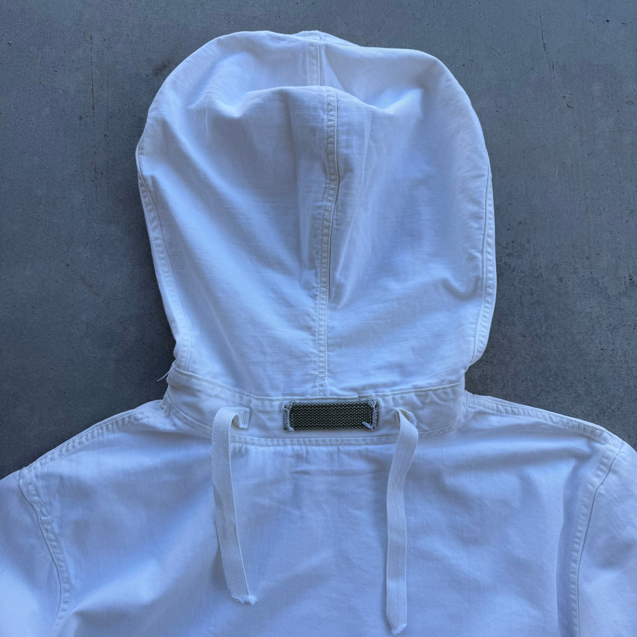 General wear, check all measurements before purchasing, no refund will be allowed all information is provided in each description. Chest is across pit 2 pit measurement, length is from top of collar to the bottom hem, sleeve is outer sleeve length, shoulder is from the shoulder point across just like chest. Authentic 1940’s USN White Gunner Smock Anorak Jacket, a quintessential piece of WWII naval history that has become a staple inspiration for modern archival and streetwear design. Originally utilized during WWIi deck crews for protection in harsh conditions, this smock is crafted from a durable cotton-polyester blend in a classic off-white colorway. It features the iconic "box" silhouette with an integrated hood, adjustable drawstring details, and dual chest pockets. This garment shows general vintage wear consistent with its age, providing a unique natural patina and honest character.