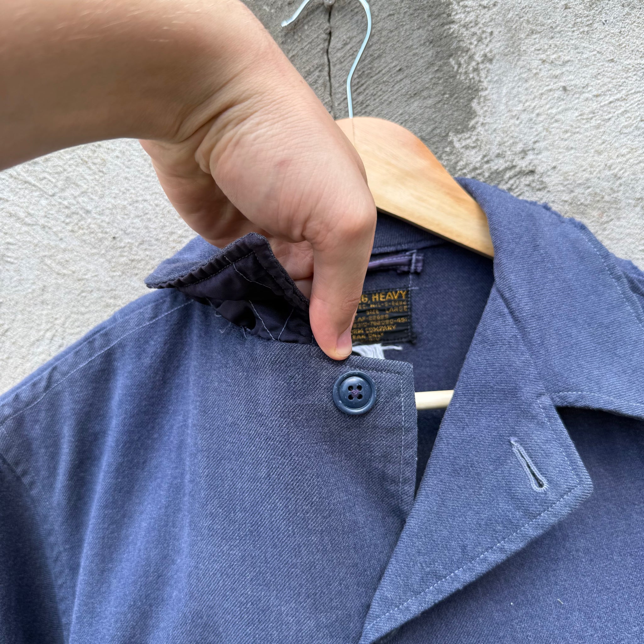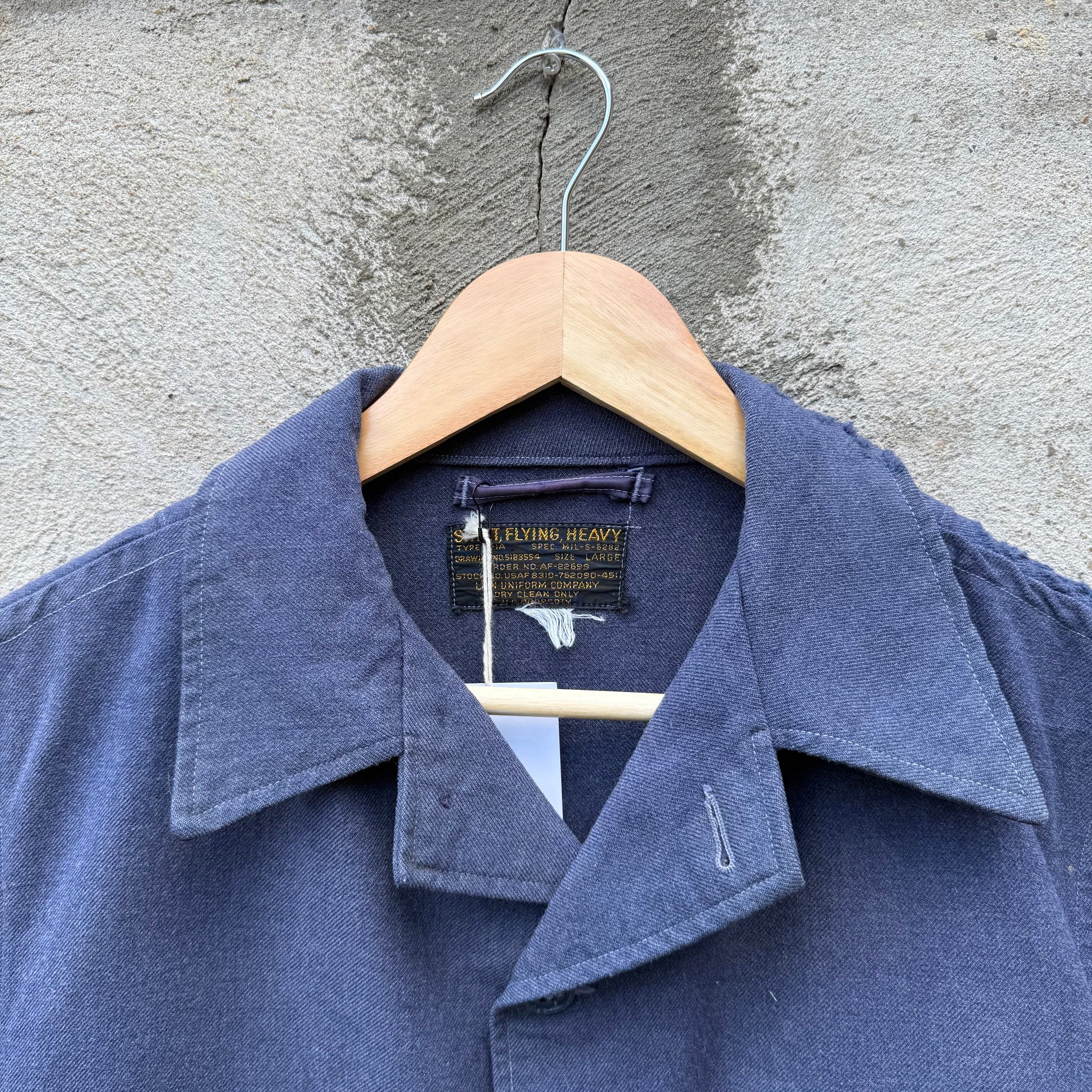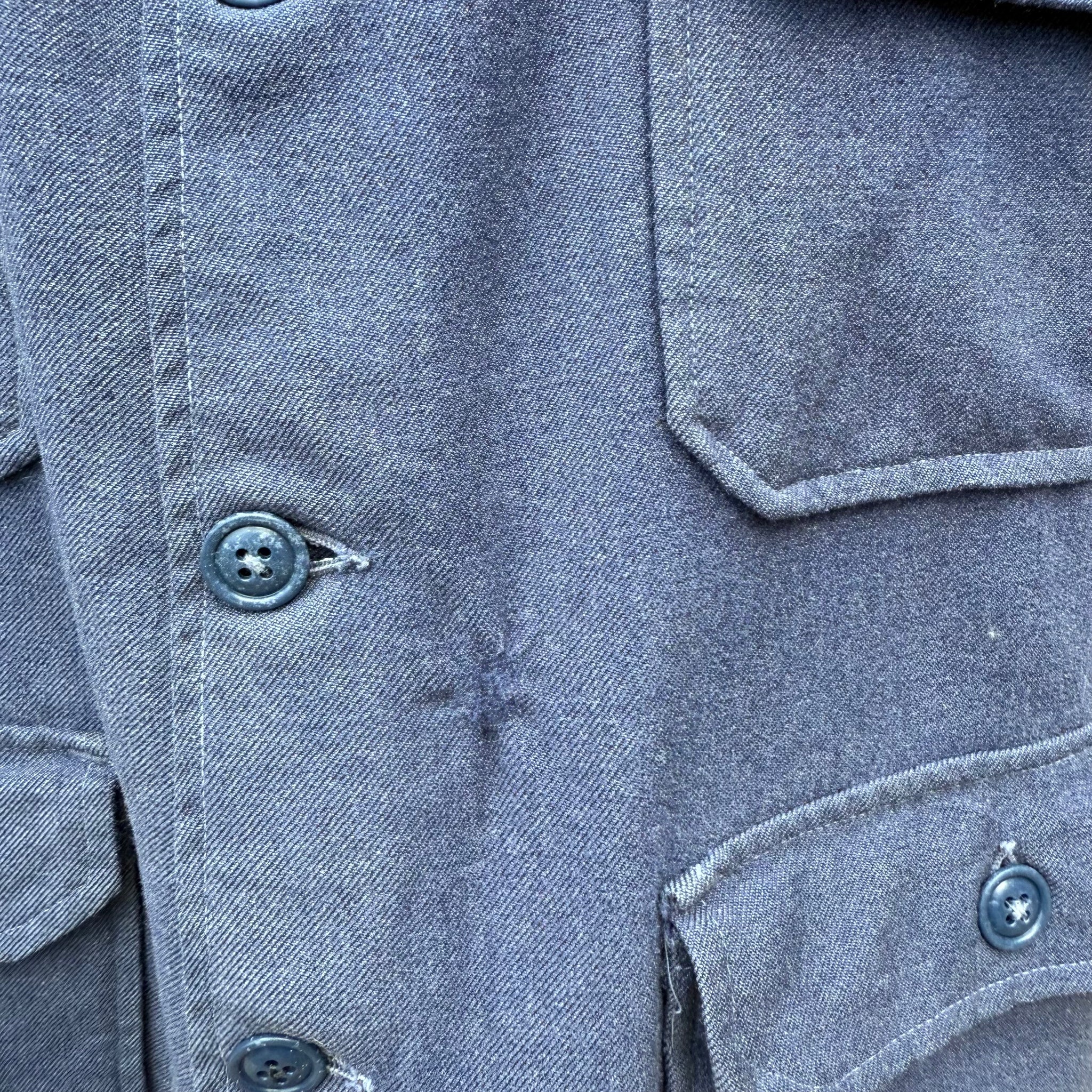 General wear, check all measurements before purchasing, no refund will be allowed all information is provided in each description. Chest is across pit 2 pit measurement, length is from top of collar to the bottom hem, sleeve is outer sleeve length, shoulder is from the shoulder point across just like chest.USAF Flying heavy shirt, chore coat style, 4 front flap pockets, USAF True Vintage, 1950's black tag, very rare jacket, Made In USA, military issued, true vintage jacket, wool blend, nice breathable and also warm layering jacket, button closer, some flaws and minor holes and wear throughout and repairs shown in photos.,faded navy blue color, 100% wool, Type A-1A, Lion Uniform Company.