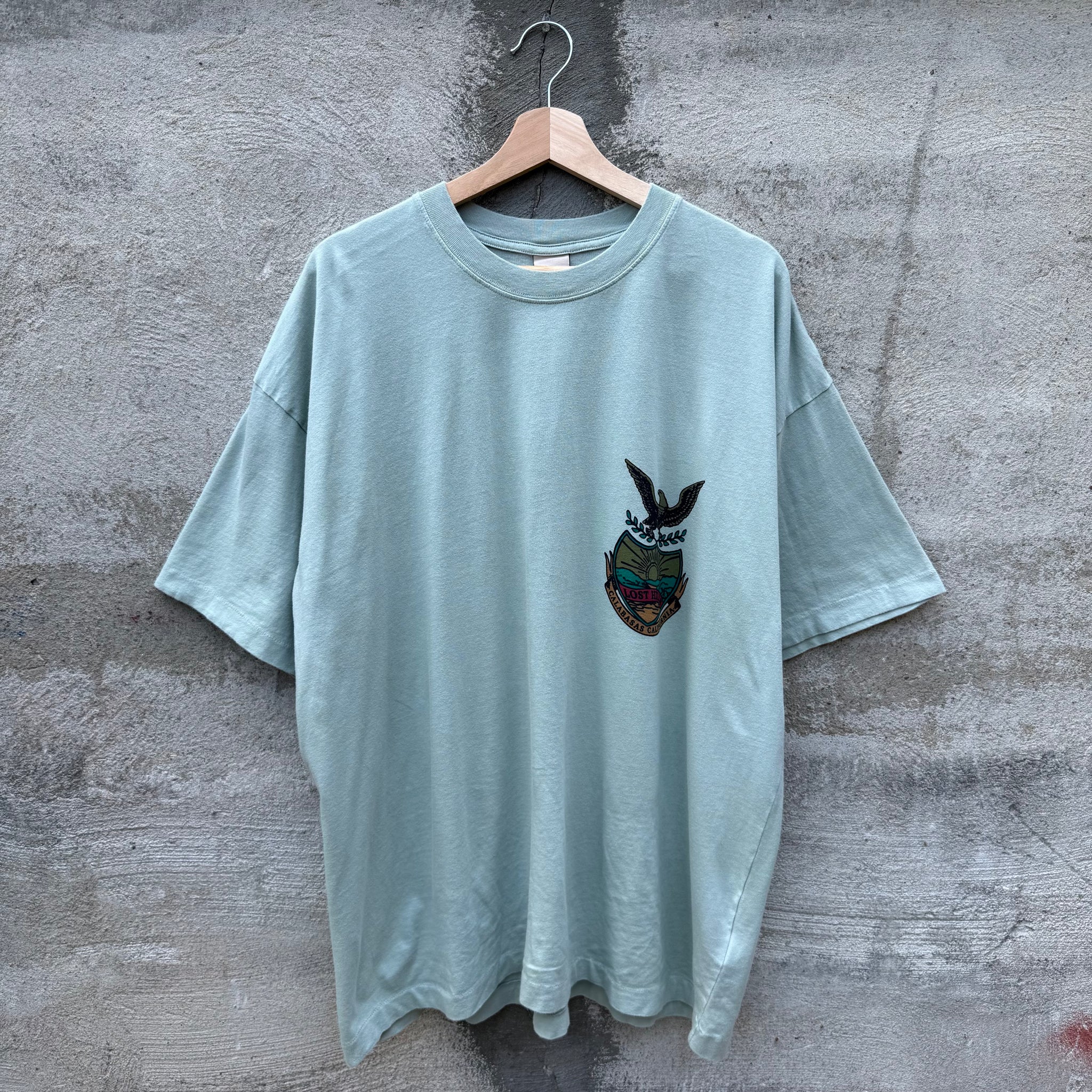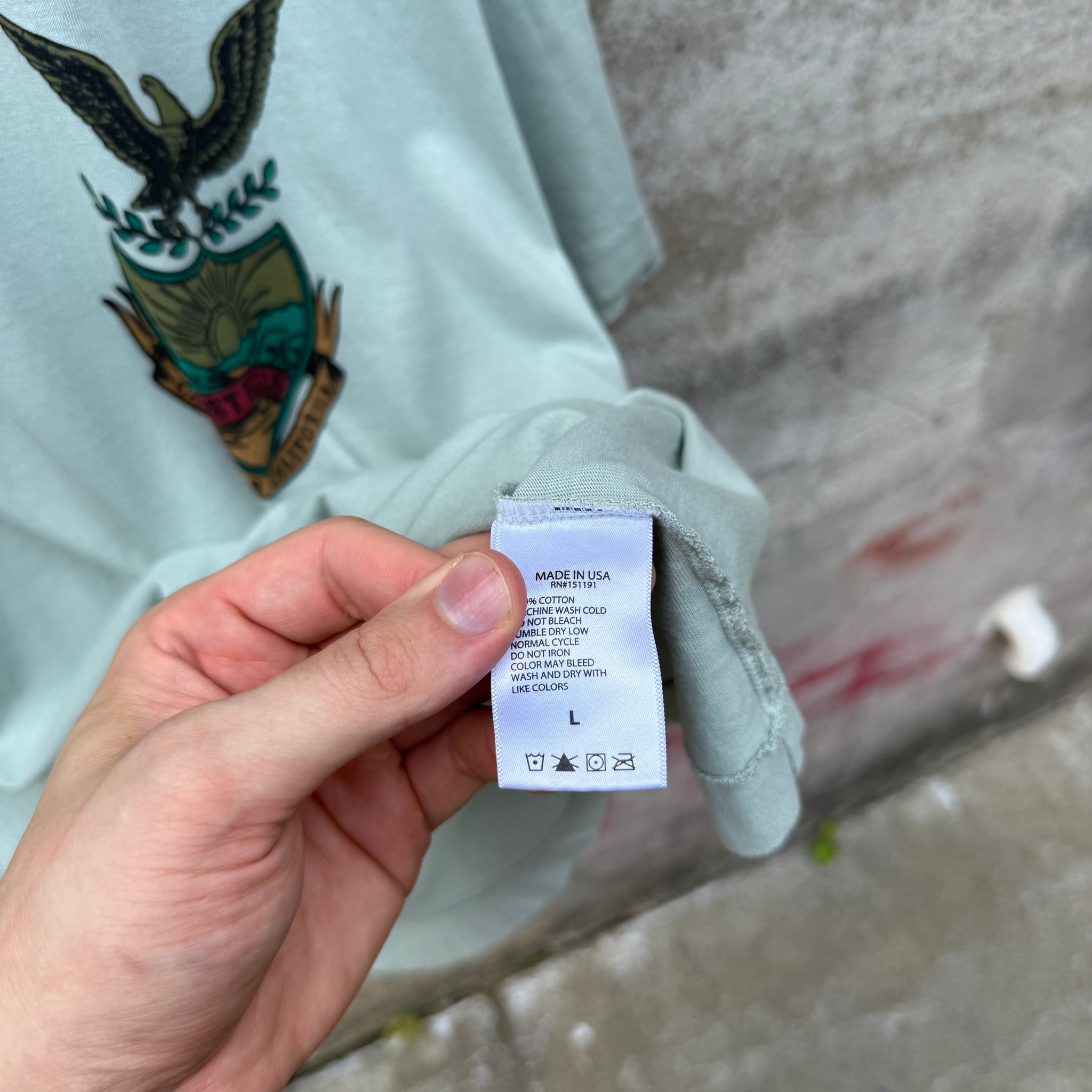 General wear, check all measurements before purchasing, no refund will be allowed all information is provided in each description. Chest is across pit 2 pit measurement, length is from top of collar to the bottom hem, sleeve is outer sleeve length, shoulder is from the shoulder point across just like chest. deadstock YZY Eargle crest shirt, faded olive green color, soft cotton shirt, oversized fit like typical yzy tops, single stitch sleeve, made in USA, 100% cotton, vintage inspired shirt, great shirt, pin hole on the back shoulder shown in photos.